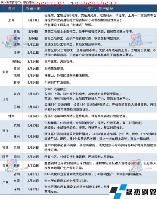據(jù)統(tǒng)計,截至3月15日,全國多個省市發(fā)布停工停產(chǎn)情況。其中受疫情影響最大的吉林省于3月12日宣布,長春市主要厚壁無縫鋼管倉庫暫停出庫,當(dāng)?shù)亟ú氖袌鼋煌哆M(jìn)入暫時停滯狀態(tài),倉庫入庫及本地?zé)o縫厚壁鋼管廠家生產(chǎn)暫時正常。深圳市于3月12日宣布,全市范圍內(nèi)所有建設(shè)工地暫定停工排查4天,南山及福田區(qū)域厚壁無縫鋼管市場預(yù)計共影響需求量約6640噸,深圳全市范圍初步預(yù)計共影響建筑厚壁無縫鋼管需求量約6萬噸。與此同時,全國其他地區(qū)鋼貿(mào)交易也受到影響,部分工地開始停工,物流運(yùn)輸暫停服務(wù)。具體情況如下: