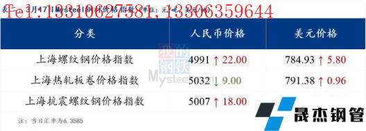 3月17日普鋼絕對(duì)價(jià)格指數(shù)變化:綜合指數(shù)5193.62,上漲21.4;螺紋鋼指數(shù)4950.59,上漲33.42;線材指數(shù)5281.15,上漲28.96;熱軋板卷指數(shù)5102.03,上漲15.98;冷軋板卷指數(shù)5533.89,上漲16.7;中厚板指數(shù)5151.92,上漲11.47。