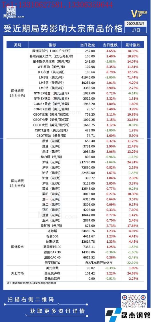 免責聲明:本網站(山東聊城晟杰無縫鋼管廠m.yztongfa.com)刊載的“受近期局勢影響大宗商品價格一覽表(3月17日)”等均源于網絡,版權歸原作者所有,且僅代表原作者觀點,本文所載信息僅供參考。轉載僅為學習與交流之目的,如無意中侵犯您的合法權益,請及時聯系刪除。本網站刊登此篇文章并不意味著本站贊同其觀點或證實其內容的真實性,我們不對其科學性、嚴肅性等作任何形式的保證。如果侵犯了您的版權,請盡快聯系我們予以撤銷,謝謝合作!