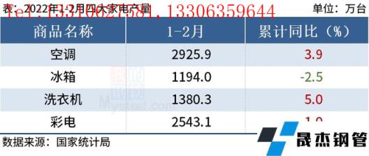 免責聲明:本網站(山東聊城晟杰無縫鋼管廠m.yztongfa.com)刊載的“統計局:1-2月中國四大家電產量3增1降”等均源于網絡,版權歸原作者所有,且僅代表原作者觀點,本文所載信息僅供參考。轉載僅為學習與交流之目的,如無意中侵犯您的合法權益,請及時聯系刪除。本網站刊登此篇文章并不意味著本站贊同其觀點或證實其內容的真實性,我們不對其科學性、嚴肅性等作任何形式的保證。如果侵犯了您的版權,請盡快聯系我們予以撤銷,謝謝合作!