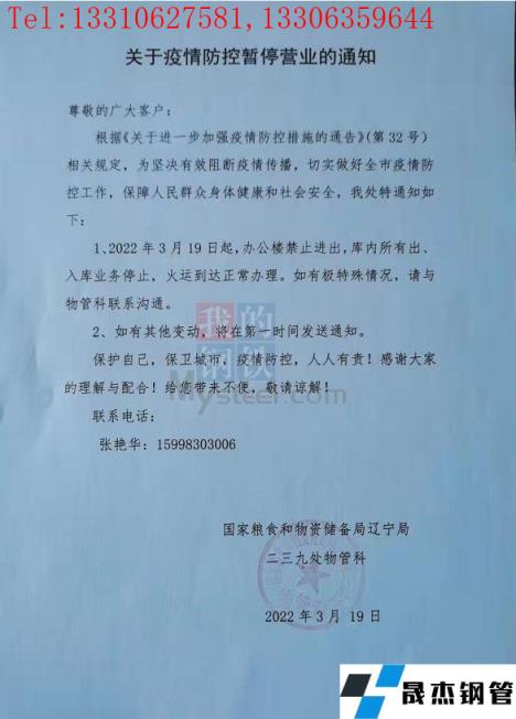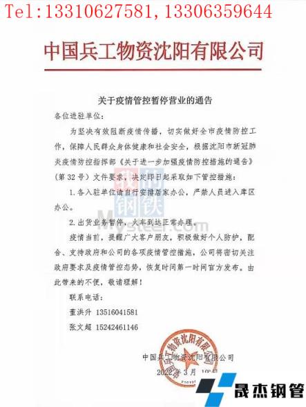 目前沈陽(yáng)厚壁無(wú)縫鋼管中心批發(fā)市場(chǎng)已發(fā)布通告,19日起北一西路東西樓試試封閉管控、嚴(yán)禁人員進(jìn)入辦公,出庫(kù)業(yè)務(wù)暫停、火車到達(dá)正常辦理;中國(guó)兵工物資125庫(kù)通告19日起嚴(yán)禁人員進(jìn)入庫(kù)區(qū)辦公,出庫(kù)業(yè)務(wù)暫停、火車到達(dá)正常辦理;國(guó)家糧食和物資儲(chǔ)備局遼寧局二三九處通告19日起辦公樓嚴(yán)禁進(jìn)出,庫(kù)內(nèi)所有出入庫(kù)業(yè)務(wù)暫停、火運(yùn)到達(dá)正常辦理。市內(nèi)其他主要厚壁無(wú)縫鋼管市場(chǎng)反饋暫時(shí)正常辦公及出庫(kù),但從防控指揮部通告內(nèi)容來(lái)看、也有暫停營(yíng)業(yè)的傾向。(通告見文末圖片)