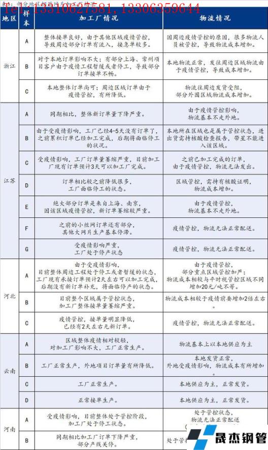 截至3月23日,匯總了部分省份19家鋼筋網(wǎng)片加工廠最新信息,其中浙江3家,江蘇7家,河北3家,云南4家,河南2家。從調(diào)研結(jié)果來看,江蘇、河北、河南受疫情影響較嚴(yán)重,因工程項(xiàng)目停工或者暫緩對于網(wǎng)片需求整體有遞延,導(dǎo)致加工廠新訂單相較于往年有個(gè)明顯的萎縮,部分沒有受太大影響的區(qū)域物流成本也有相應(yīng)的增加。具體情況如下: