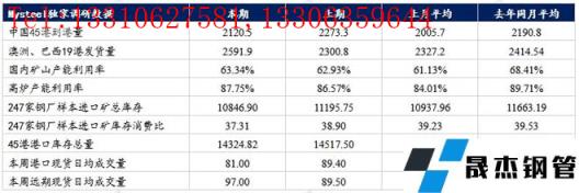 庫存:本周統計中國45港鐵礦石庫存總量14324.82萬噸,環比降庫192.68萬噸。日均疏港量315.66萬噸,環比增17.88萬噸。目前在港船舶數89條較上期降20條。