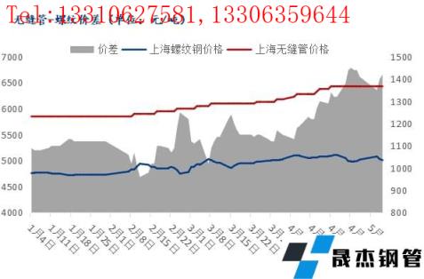 今年以來,國內無縫管價格不斷走高,在近幾個月中的階段性調整中始終保持堅挺運行。以上海市場價格為例,截止5月7號上海市場108*4.5mm主流無縫管價格為6430元/噸,2月、4月出現兩波明顯的上漲行情,進入5月價格開啟震蕩調整行情。通過對比上海地區無縫管與螺紋價差,我們可以發現兩個品種間的價差處于擴張區間,108*4.5mm無縫管與20mm螺紋價差從年初的1090元/噸擴大到1420元/噸。那么,目前無縫管價格堅挺的主要原因有哪些?對于后期行情的參考點又在哪里?