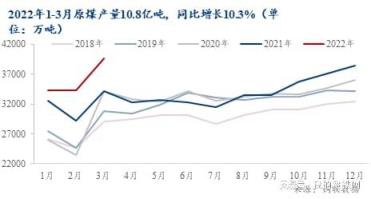 2022年1-3月全國原煤產(chǎn)量累計生產(chǎn)10.8億噸,同比增長10.3%,其中3月份原煤產(chǎn)量3.96億噸,同比增長14.8%。國家能源局3月發(fā)布《2022年能源工作指導(dǎo)意見》,提出將著力增強國內(nèi)能源生產(chǎn)保障能力,切實把能源飯碗牢牢地端在自己手里。