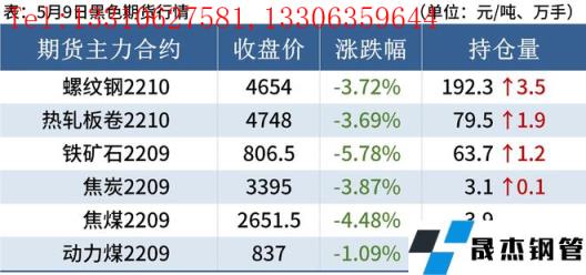 熱軋板卷:5月9日,全國24個(gè)主要城市4.75mm熱軋板卷均價(jià)5067元/噸,較上個(gè)交易日下跌60元/噸。綜合來看,美聯(lián)儲(chǔ)加息和縮表落地限制了國內(nèi)貨幣寬松的空間,國內(nèi)多地區(qū)疫情爆發(fā),國內(nèi)外的雙重因素導(dǎo)致情緒不佳,無縫厚壁鋼管廠家目前面臨虧損的局面,焦煤焦炭的首輪提降已經(jīng)落地,原料端價(jià)格支撐進(jìn)行弱化,原料與成材呈現(xiàn)負(fù)反饋。預(yù)計(jì)下半年經(jīng)濟(jì)沖擊影響依舊,短期成材或?qū)⒕S持偏弱態(tài)勢(shì)。因此,預(yù)計(jì)全國熱軋板卷10日價(jià)格維持下行趨勢(shì)。