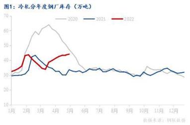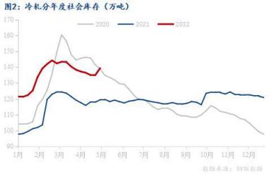 截止5月4日,監(jiān)測的26個城市庫存,冷軋板卷社會庫存為139.41萬噸。社會庫存雖未到達年內(nèi)的峰值,但也同樣處于相對高位。年同比增加19.97萬噸,同比數(shù)據(jù)同樣驚人。主要是汽車、家電等制造業(yè),在疫情下產(chǎn)量紛紛出現(xiàn)下滑,終端用鋼量明顯縮量。但短期局部區(qū)域物流受疫情防控影響,廠庫無法向社庫端去進行轉移,因此社庫的累積速度并不及廠庫。