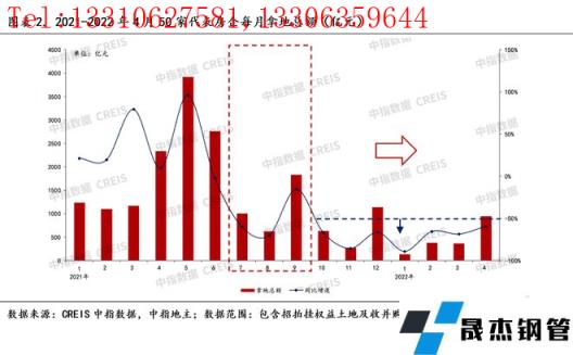 那么,預(yù)判今年用鋼情況的話,可以參考從2021年-2022年4月份以來的50家代表房企每月拿地總額數(shù)據(jù),假如往前倒推6個(gè)月,2022年1月起的房地產(chǎn)用鋼情況大致可以參照2021年7月起的拿地?cái)?shù)據(jù),因?yàn)樗⒎且灰粚?duì)應(yīng)的關(guān)系。我們可以看到,從2021年10月以來的拿地?cái)?shù)據(jù)不容樂觀,單月同比跌幅持續(xù)低于-50%水平線以下,預(yù)示接下來三季度的房地產(chǎn)新開工以及其用鋼情況理論上應(yīng)該是很差的。