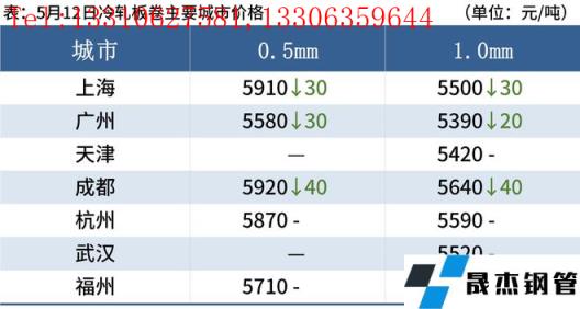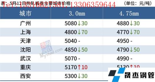 冷軋板卷:5月12日,全國24個主要城市1.0mm冷卷均價5569元/噸,較上個交易日下跌7元/噸。今日黑色系期貨盤面呈高開低走,現貨市場報價混亂,部分商家報價以穩為主,今日成交表現偏差。心態方面,南方近期進入汛期,市場需求或將有所滯后,商家心態多謹慎,當下操作以出貨成交為主。庫存方面,據不完全統計,本周冷軋無縫厚壁鋼管廠家庫存43.05萬噸,周環比減少1.08萬噸,社會庫存136.81萬噸,周環比減少2.60萬噸,周消費量83.81萬噸,環比增加0.50萬噸。綜合來看,故預計13日國內冷軋板卷價格或將震蕩偏弱運行。
