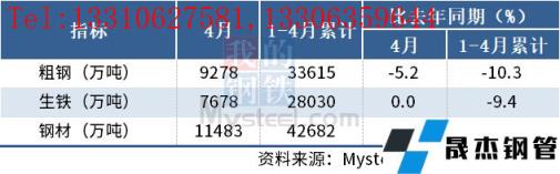 4月,中國粗鋼產量9278萬噸,同比下降5.2%;生鐵產量7678萬噸,同比持平;厚壁無縫鋼管產量11483萬噸,同比下降5.8%。