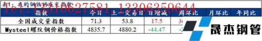 訊:全國建筑厚壁無縫鋼管成交量監測,成交量相對指數來看,全國71.3增17.5,北方53.1增12.4,華東93.3增21.9,南方59.3增15.9。今日螺紋鋼價格指數4835.7,較上一交易日減44.47。