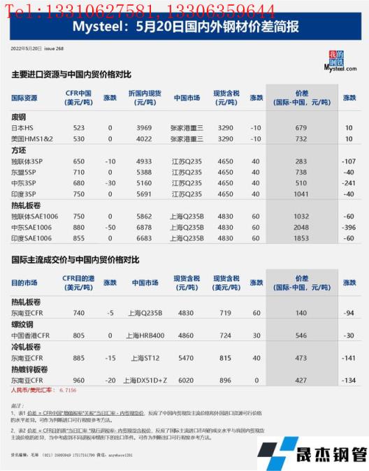 免責聲明:本網站(山東聊城晟杰無縫鋼管廠m.yztongfa.com)刊載的“2022年05月20日日報:國內外鋼材_無縫鋼管價差匯總(2022.5.20)”等均源于網絡,版權歸原作者所有,且僅代表原作者觀點,本文所載信息僅供參考。轉載僅為學習與交流之目的,如無意中侵犯您的合法權益,請及時聯系刪除。本網站刊登此篇文章并不意味著本站贊同其觀點或證實其內容的真實性,我們不對其科學性、嚴肅性等作任何形式的保證。如果侵犯了您的版權,請盡快聯系我們予以撤銷,謝謝合作!
