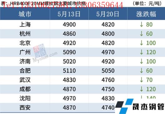 據監測,截至5月20日,全國主要城市20mm三級抗震螺紋鋼均價4849元/噸,較5月13日下跌107元/噸;8.0mmHPB300高線均價5101/噸,較5月7日下跌104元/噸。