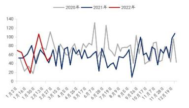 俄烏沖突以來,球團(tuán)的供應(yīng)確實(shí)受到一定影響,但從海關(guān)進(jìn)口數(shù)據(jù)來看,今年1-2月份烏克蘭球團(tuán)月度進(jìn)口量也就是在20萬噸附近,折合每周約5萬噸;而從圖2中可以看出,2月中以來國產(chǎn)球團(tuán)產(chǎn)量持續(xù)增加,從38家球團(tuán)廠周度產(chǎn)量來看,球團(tuán)產(chǎn)量由111.05萬噸增至147.28萬噸(2022年2月21日與2022年4月初相比,下文時(shí)間點(diǎn)同上),114家無縫厚壁鋼管廠家?guī)齑嬷星驁F(tuán)產(chǎn)量由18.86萬噸/天增至21.63萬噸/天,折合周度產(chǎn)量每周增加33.39萬噸,按照代表性折算約83.48萬噸,足以彌補(bǔ)烏克蘭的影響。