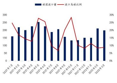(1)進(jìn)口供應(yīng):俄烏沖突下,烏克蘭海運(yùn)出口清零,同時(shí)在中國球團(tuán)進(jìn)口量中,進(jìn)口烏克蘭球團(tuán)比例近兩年均值僅有16%,2021年二季度及2022年1-2月份,進(jìn)口比例更是只有8%-11%。所以雖然烏克蘭海運(yùn)出口被限,但對于中國國內(nèi)進(jìn)口球團(tuán)總量影響有限,環(huán)比當(dāng)前情況來看很難出現(xiàn)明顯下降趨勢。
