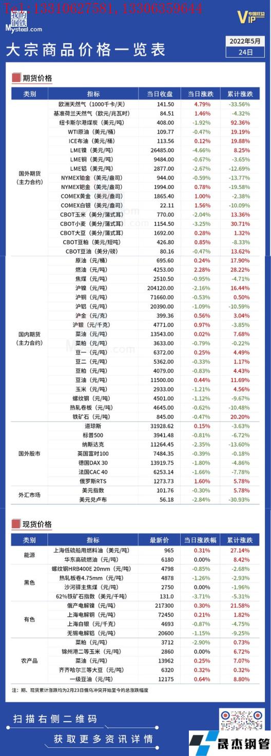 免責聲明:本網站(山東聊城晟杰無縫鋼管廠m.yztongfa.com)刊載的“俄烏局勢丨大宗商品價格一覽表(5月24日)”等均源于網絡,版權歸原作者所有,且僅代表原作者觀點,本文所載信息僅供參考。轉載僅為學習與交流之目的,如無意中侵犯您的合法權益,請及時聯系刪除。本網站刊登此篇文章并不意味著本站贊同其觀點或證實其內容的真實性,我們不對其科學性、嚴肅性等作任何形式的保證。如果侵犯了您的版權,請盡快聯系我們予以撤銷,謝謝合作!