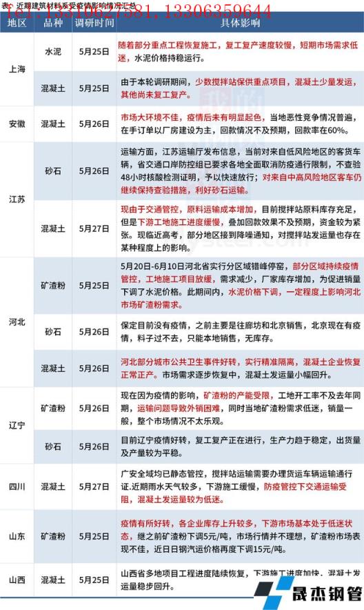 截至5月27日,據百年建筑網調研,8個省份建材市場受到了不同程度的影響。進入五月下旬后,施工整體進度尚未進入“減速”階段,今年整體施工進度提升緩慢,市場需求降幅拐點未來臨。目前疫情防控形勢繼續好轉,建筑材料發運量有一定上升空間?,F華東地區疫情雖得到了一定的控制,但由于交通管控因素,材料運輸仍存在一定壓力。具體情況如下: