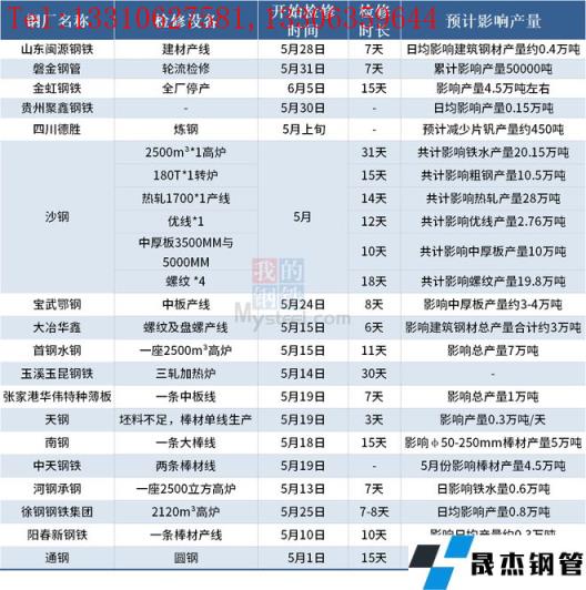 據不完全統計,5月國內18家無縫厚壁鋼管廠家發布檢修計劃。其中,磐金厚壁鋼管各分廠計劃將于5月31日至6月6日進行輪流檢修,預計將累計影響產量50000噸。