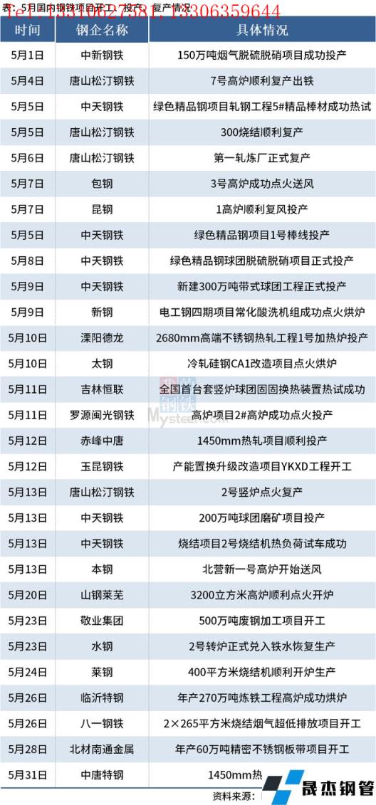免責聲明:本網站(山東聊城晟杰無縫鋼管廠m.yztongfa.com)刊載的“5月國內29個鋼鐵項目開工、投產或復產”等均源于網絡,版權歸原作者所有,且僅代表原作者觀點,本文所載信息僅供參考。轉載僅為學習與交流之目的,如無意中侵犯您的合法權益,請及時聯系刪除。本網站刊登此篇文章并不意味著本站贊同其觀點或證實其內容的真實性,我們不對其科學性、嚴肅性等作任何形式的保證。如果侵犯了您的版權,請盡快聯系我們予以撤銷,謝謝合作!