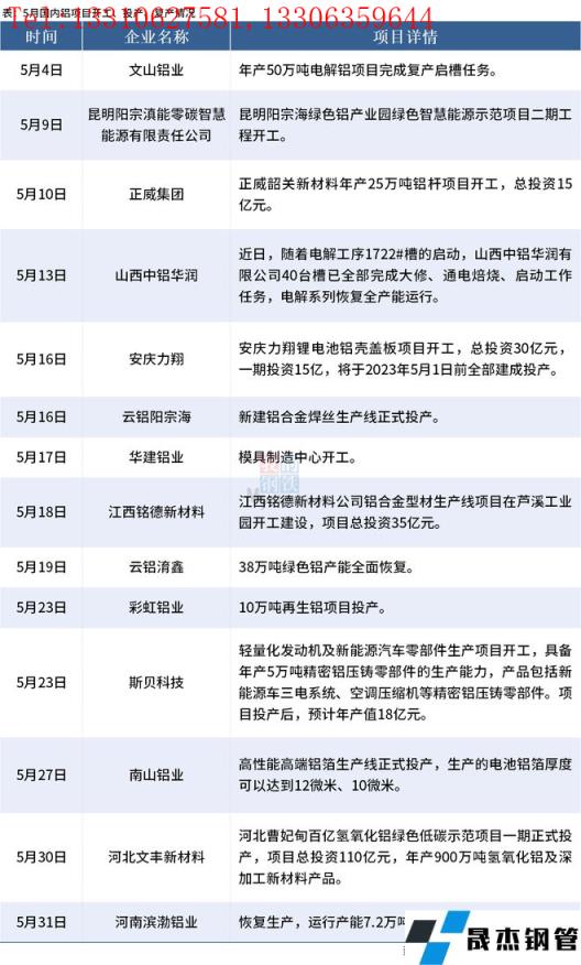 據(jù)不完全整理,2022年5月國(guó)內(nèi)共14個(gè)鋁項(xiàng)目開(kāi)工、投產(chǎn)或復(fù)產(chǎn)。