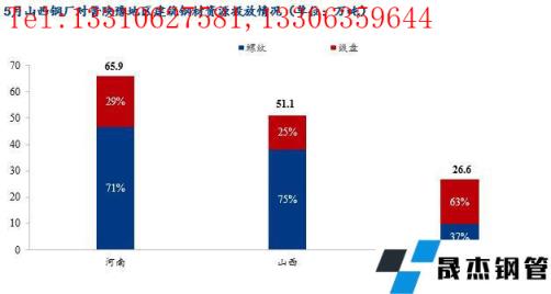 在統(tǒng)計(jì)的11家山西無縫厚壁鋼管廠家中,5月份向晉陜豫地區(qū)建筑厚壁無縫鋼管資源投放總量為143.6萬噸,其中螺紋94.6萬噸,占比為66%,線盤49萬噸,占比為34%。分區(qū)域來看,對山西地區(qū)投放51.1萬噸,占比為36%;對河南地區(qū)投放65.9萬噸,占比為46%;對陜西地區(qū)投放26.6萬噸,占比為19%。據(jù)數(shù)據(jù)顯示,5月份山西無縫厚壁鋼管廠家向晉陜豫地區(qū)投放建筑厚壁無縫鋼管資源總量較4月份增加24.27萬噸。分區(qū)域來看,5月對山西地區(qū)的投放增量最大,主要是山西區(qū)域價(jià)格持續(xù)高于周邊市場,山西省內(nèi)資源多在省內(nèi)消化為主。