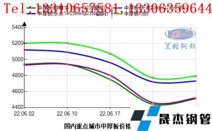 6月份上旬國內宏觀市場消息面多空博弈,下游商家觀望情緒加重,國內中厚板市場需求受到壓制,市場報價小幅趨弱。而后因美聯儲激進加息政策出臺,全球金融市場受到沖擊加劇,使得目前本已處于經濟下行期的全球經濟再次承壓,對于國內市場直接反饋至期貨市場,在美聯儲加息消息發酵后,期現市場短期內呈現斷崖式下跌,在不足一周的交易日內,國內中厚板均價下調幅度在240元左右,相較于其他厚壁鋼管品種,中厚板市場抗跌性仍處于強勢一方。