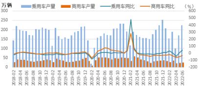 圖2 2017-2022年乘用車和商用車月度產量及同比增速