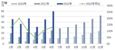 6月份,新能源汽車產銷分別完成59萬輛和59.6萬輛,同比均增長1.3倍,產銷量同比增速明顯回升。1-6月份,新能源汽車產銷分別完成266.1萬輛和260萬輛,同比均增長1.2倍,市場占有率21.6%。中汽協預計,2022年新能源汽車銷量有望達到550萬輛,同比增長56%以上。
