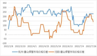 圖3 2022年杭州-唐山、沈陽(yáng)-唐山焊管價(jià)差走勢(shì)圖