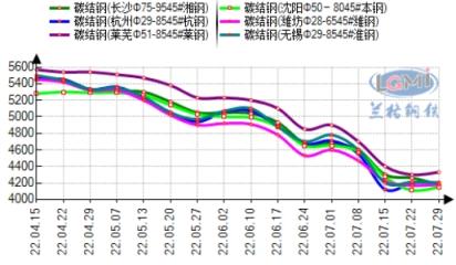 7月份國內(nèi)優(yōu)特鋼市場價格大幅下跌。據(jù)云商平臺監(jiān)測數(shù)據(jù)顯示,截至7月29日,全國碳結(jié)鋼(45#)平均價格4347元,較上月同期跌500元左右;全國合結(jié)鋼(40Cr)平均價格4588元,較上月同期跌500元左右。因市場成交量較上個月稍有好轉(zhuǎn),優(yōu)特鋼價格震蕩運行,無縫鋼管廠家出貨量稍有增加,無縫鋼管廠家庫存均有小幅下降,但社會庫存持續(xù)累積,市場價格短期低位震蕩為主。在價格企穩(wěn)反彈后,成交量稍有好轉(zhuǎn),市場交投氛圍較為積極,剛需與投機均有成交,市場信心提振,不過受限于今年需求遠低于往年同期水平,需求端兌現(xiàn)仍然是一個漫長的道路。