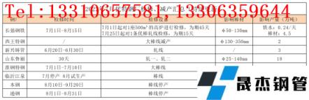 7月份無縫鋼管廠家出廠價格大幅下調(diào)。無縫鋼管廠家盈利情況仍不理想,整體厚壁鋼管出庫困難,無縫鋼管廠家多以虧損為主,在資金壓力較大情況下,有意打壓原料價格,當前無縫鋼管廠家對原料的采購積極性一般。近期無縫鋼管廠家考慮到廠庫居高不下,成本明顯虧損的情況下,各無縫鋼管廠家紛紛安排檢修減產(chǎn),具體檢修情況如下: