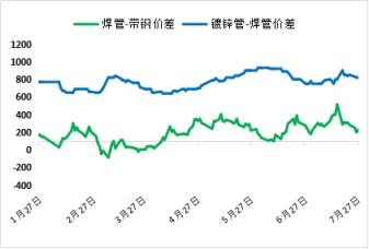 7月焊管較帶鋼價差,鍍鋅管較焊管價差走勢趨于一致。月中階段走擴(kuò)后,價差空間再次收窄,月末焊管與原料價差收窄幅度大于鍍鋅管。目前管廠廠內(nèi)原料輪換周期拉長至20天左右,部分規(guī)格拉長至1個月之久,月內(nèi)出現(xiàn)停購原料3-5天的情況。結(jié)算周期內(nèi)焊管生產(chǎn)利潤平均盈利29元,架子管平均虧損7元;鍍鋅管較焊管價差收縮91元,管企綜合生產(chǎn)利潤改善不明顯。