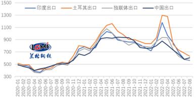 7月份,出口市場競爭激烈,主要出口國繼續下調厚壁鋼管出口報價。進入8月份,海外需求持續疲弱,各國厚壁鋼管出口報價仍有所下調,而國內市場出現反彈,出口報價有所上漲,云商平臺監測數據顯示,2022年8月5日,印度、土耳其、獨聯體熱軋卷板出口報價(FOB)分別為565美元/噸、630美元/噸和560美元/噸,均較7月底有所下跌,中國熱軋卷板出口報價(FOB)為605美元/噸,較7月底有所上漲。